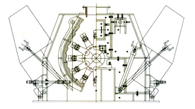在PCXK可逆式防堵細(xì)碎機(jī)的中央布置有轉(zhuǎn)子,轉(zhuǎn)子帶動錘頭作高速圓周運(yùn)動,對稱于轉(zhuǎn)子兩側(cè)有可調(diào)節(jié)的破碎齒板,破碎齒板可隨側(cè)蓋作開放性打開,特殊設(shè)計(jì)的齒板與錘頭的運(yùn)動軌跡構(gòu)成破碎腔,從進(jìn)料口處落下的物料,首先被高速旋轉(zhuǎn)的錘頭擊向破碎齒板,隨即又被齒板反彈向向錘頭或其它破碎齒面,物料在破碎腔中如此來回跳動,并在運(yùn)動過程中相互碰撞,被進(jìn)一步擊破,達(dá)到設(shè)計(jì)粒度的物料從破碎機(jī)底部的出料口排出。出料粒度可由調(diào)節(jié)機(jī)構(gòu)調(diào)整控制。