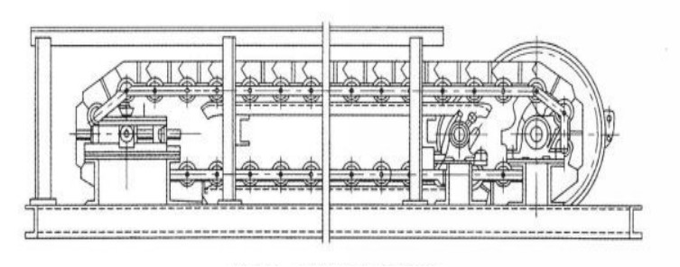 采用節(jié)距為228.6mm(9吋)的高強(qiáng)度推土機(jī)模鍛鏈條為牽引件,兩根鏈條繞過安裝在機(jī)體頭部的一對驅(qū)動鏈輪和機(jī)體尾部的一對張緊輪聯(lián)成封閉形回路,在兩排鏈條的每個鏈節(jié)上裝配了相互交迭的、重型結(jié)構(gòu)的輸送槽而成為一個連續(xù)的能夠運(yùn)載物料的輸送線路。其自重和物料的重量由安裝在機(jī)體上的多排支重輪、鏈托輪和滑道梁支承。傳動系統(tǒng)經(jīng)交流變頻調(diào)速電動機(jī)聯(lián)接減速機(jī),再由漲套與驅(qū)動裝置直聯(lián)驅(qū)動運(yùn)載機(jī)構(gòu)低速運(yùn)行。將尾部料倉卸入的物料沿輸送線路運(yùn)至機(jī)體的前方排出,實(shí)現(xiàn)向下方的工作機(jī)械連續(xù)均勻喂料的目的。