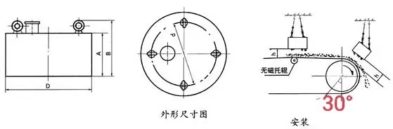 | 型號 | 適應(yīng)帶寬mm | 額定吊高h(yuǎn) mm | 磁場強(qiáng)度mT | 物料厚度≤mm | 勵磁功率≤kw | 適應(yīng)帶速≤m/s | 重量kg | 外形尺寸mm | |||