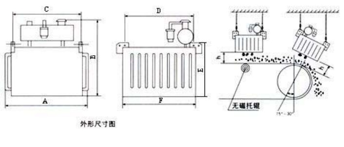 | 型號 | 項目 → | 適應帶寬 | 額定吊高 | 磁場強度 | 適應帶速 | 物料厚度 | 勵磁功率 | 重量 | 外形尺寸mm | ||||